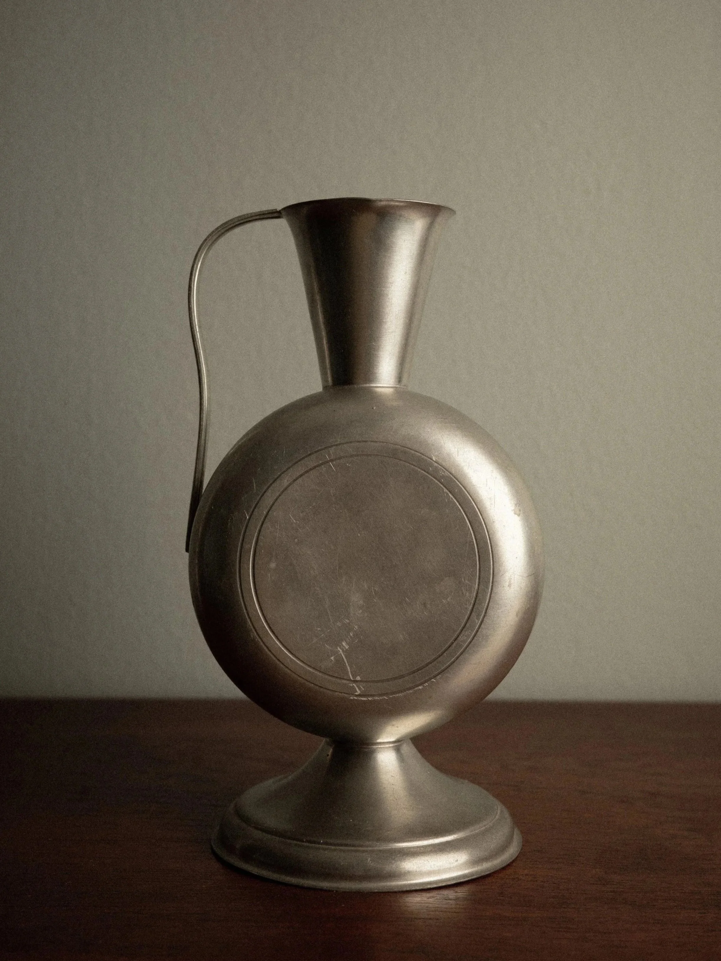 A small pewter vase perfect for your everyday bloom, featuring a shell motif at the center and a curved handle.